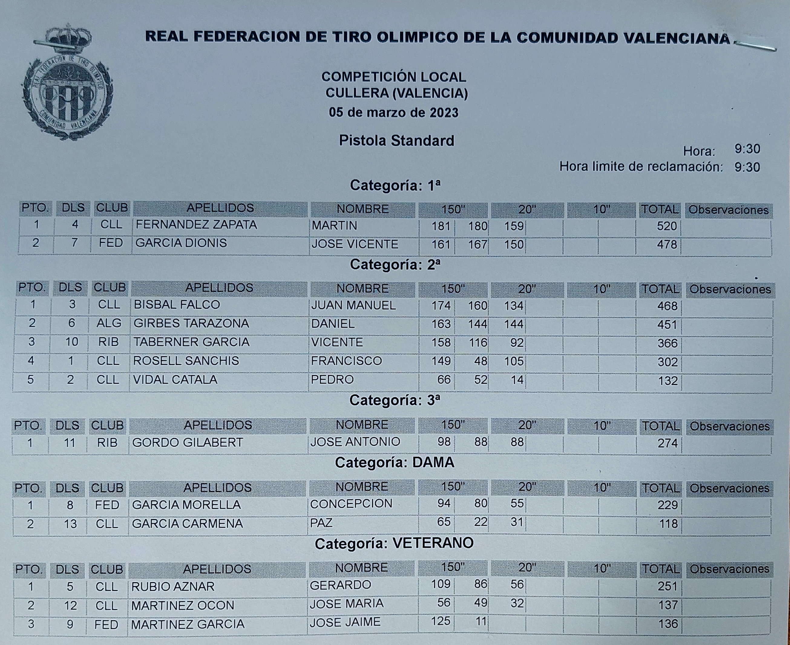 FECHA INSTALACIONES COMPETICIÓN OBSERVACIONES Sábado 4 marzo C.T.O. CULLERA ARMAS HISTÓRICAS RETROCARGA . Disciplinas agrupadas en arma corta y larga.Resultados Domingo 5 marzo C.T.O. CULLERA PISTOLA STANDARD Resultados Sábado 11 marzo C.T.O. CULLERA EXAMEN GUARDIA CIVIL . Altas nuevas.Celebrado Domingo 12 marzo C.T.O. CULLERA CARABINA Resultados Sábado 18 marzo C.T.O. CULLERA ALTA PRECISIÓN -BENCH REST BR-50- Resultados Domingo 26 marzo C.T.O. CULLERA PISTOLA FUEGO CENTRAL y DEPORTIVA . Completa, precisión y tiro rápido.Resultado 1 Resultado 2